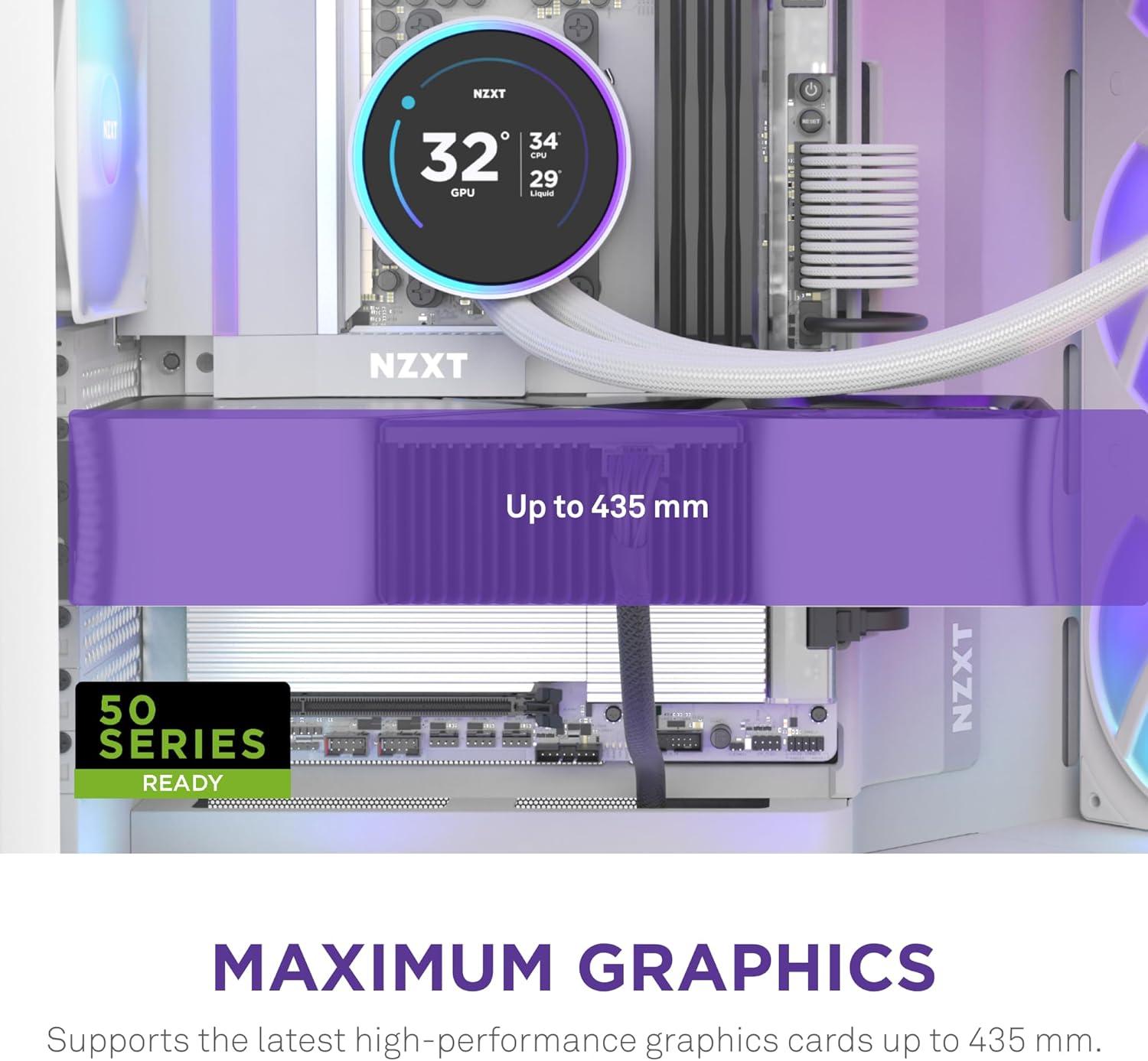 LARGE RADIATORS & GPUS — Fits up to a 420mm radiator on the top and front-right, with plenty of clearance for high-end graphics cards.