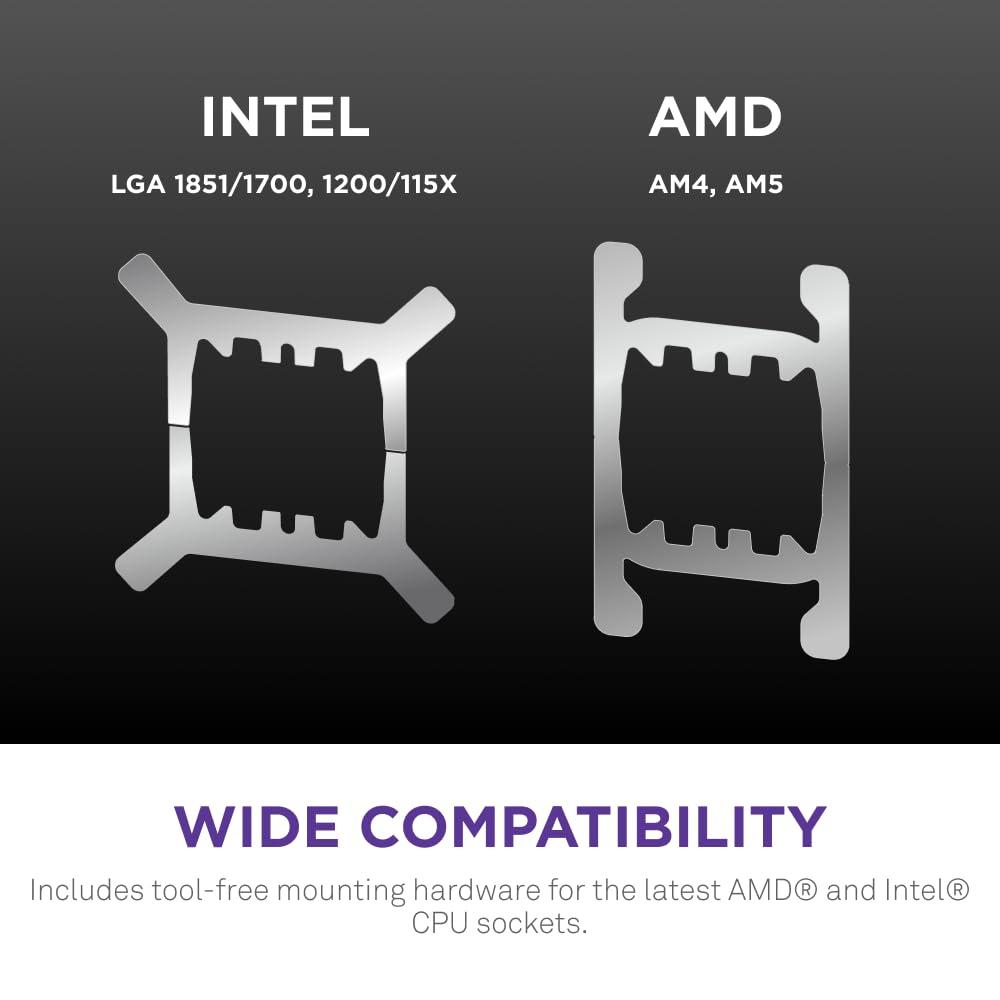 SIMPLE INSTALLATION: Get set up quickly with pre-applied thermal paste, a single breakout cable, and tool-free mounting brackets for the latest AMD (AM5, AM4) and Intel (LGA 1851/1700, 1200/115X) CPU sockets.